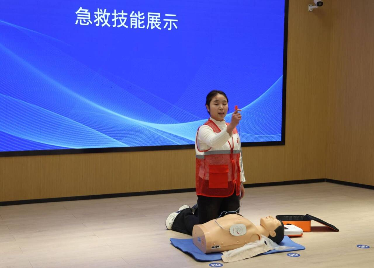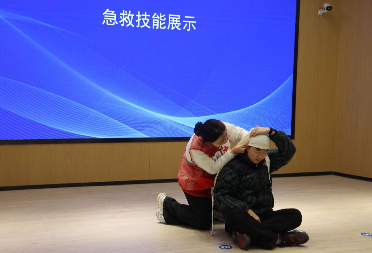演示现场,1名员工展示了成人心肺复苏(CPR+AED)操作,模拟突发心脏骤停的急救场景,完整展示了从识别呼救、胸外按压到使用AED除颤的全过程。1名员工演示了头部外伤包扎技术,展现了专业的急救处理能力。
