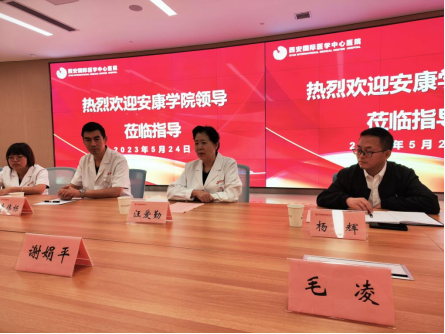 为进一步优化人才培养方案,提高人才培养质量,进一步强化毕业实习管理,加强实习基地联系,5月24日上午,公司经理谢娟平和康复治疗系教师毛凌一行前往西安国际医学中心开展实习基地调研和毕业实习检查工作,西安国际医学中心医疗总监汪爱勤、人力资源总监杨辉、康复治疗科主任李伟栋及相关带教老师出席座谈交流。